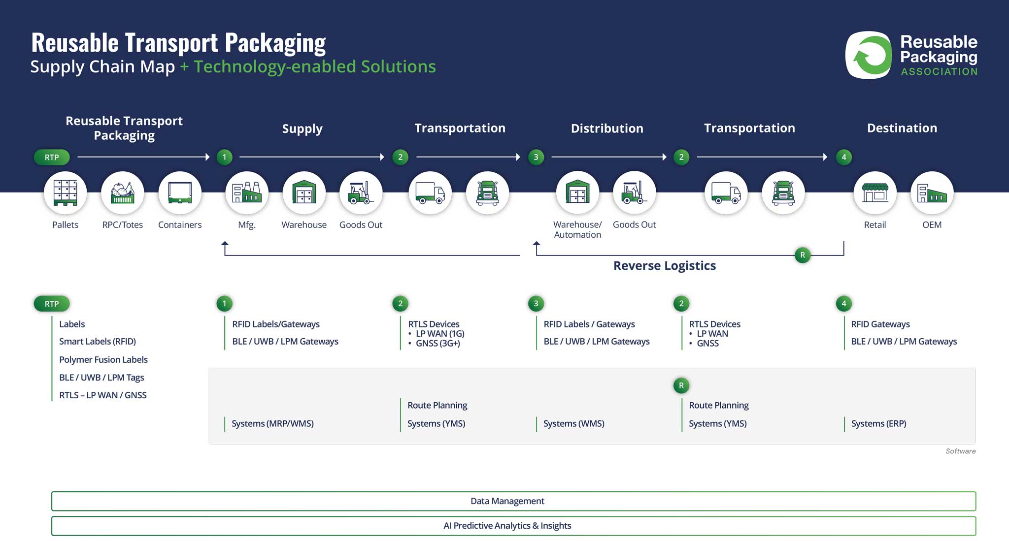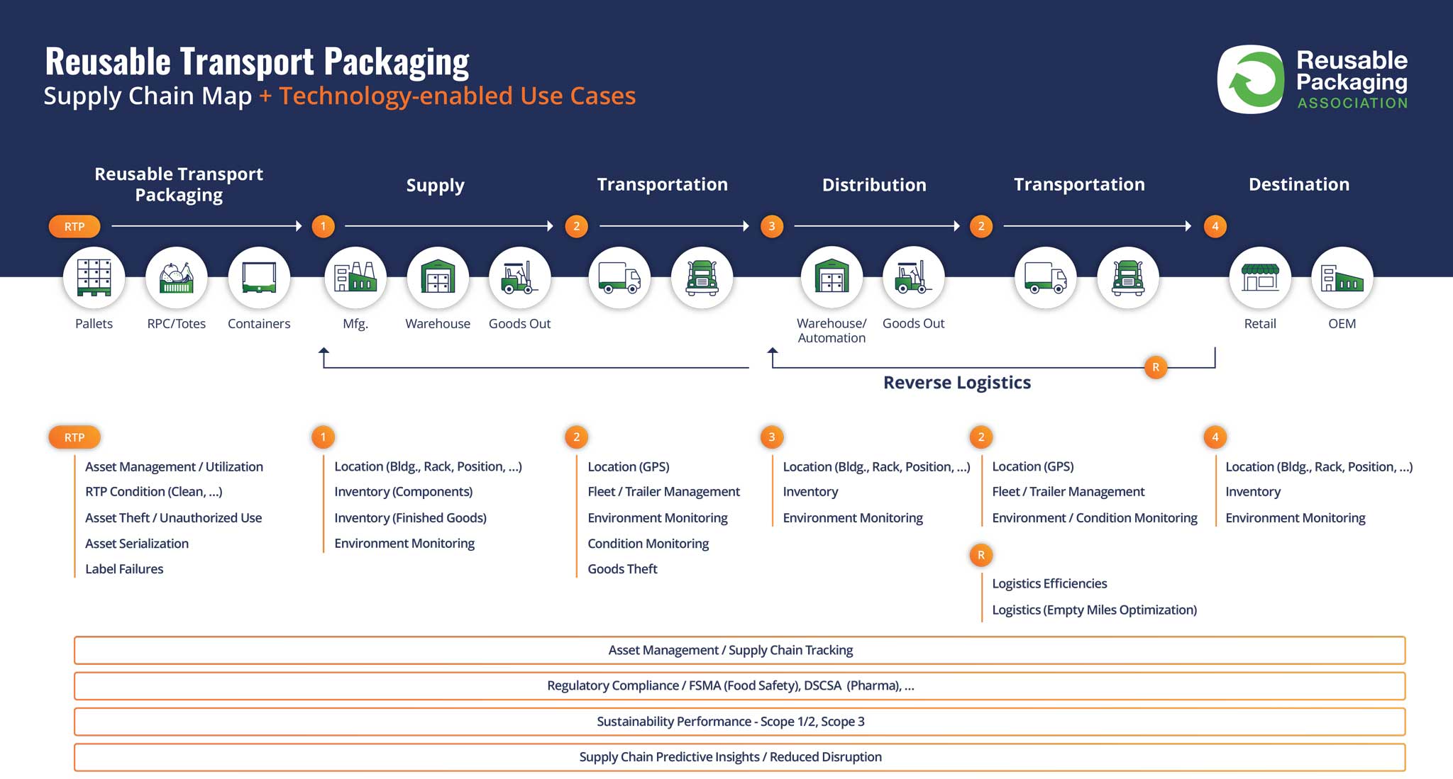 The use of reusable transport packaging is growing each year across many supply chains, which utilize pallets, totes, reusable plastic containers (RPCs), intermediate bulk containers (IBCs), and other reusable assets. Throughout the supply chain, users increasingly need to understand the location, quantity, condition, and compliance of goods moving across their customers’ broader supply chain ecosystems. From this information, users can generate actionable insights, enabling more efficient and sustainable supply chains. Key elements of the supply chain include: